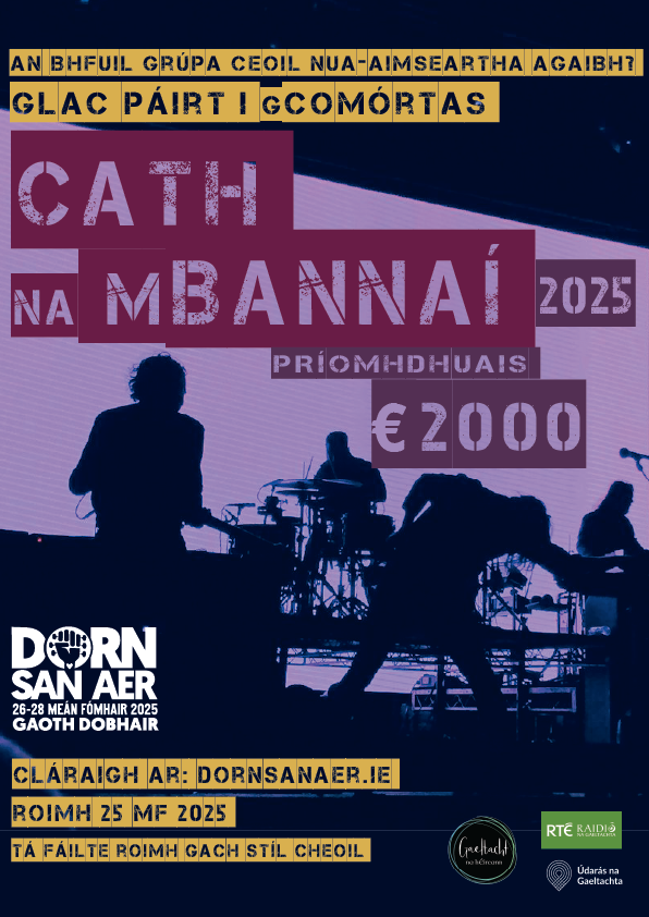 Tá muid sa tóir ar ghrúpaí agus ar cheoltóirí réabhlóideacha úra – an bhfuil tusa nó do ghrúpa ag cuartú ardáin agus seans le €2,000 a thabhairt ‘na bhaile libh – chomh maith le bhur gceol a bheith seinnte ar an raidió? Tá Dorn San Aer i gcomhar le Raidió na Gaeltachta leis an tseans sin a thabhairt daoibh.